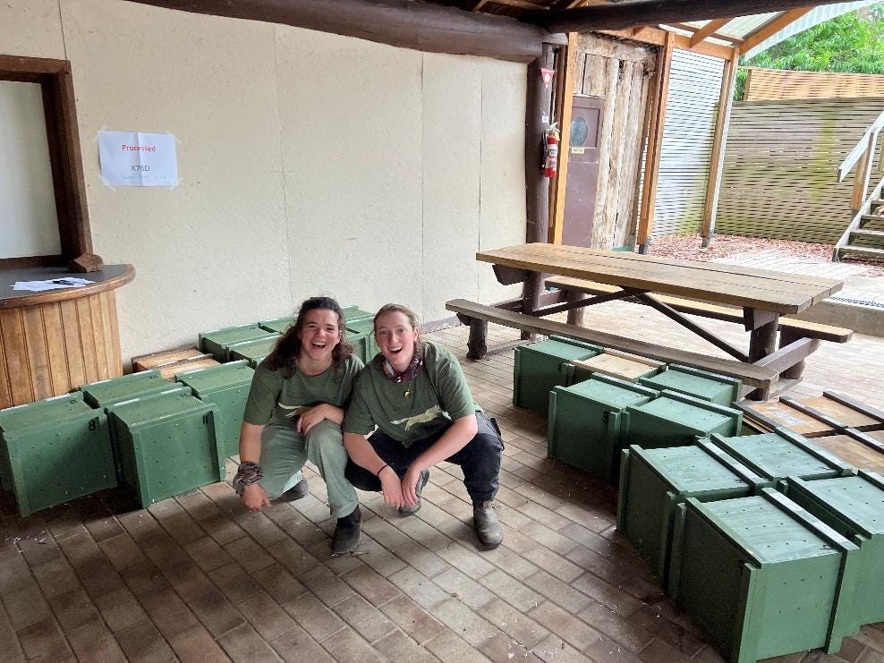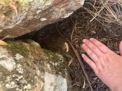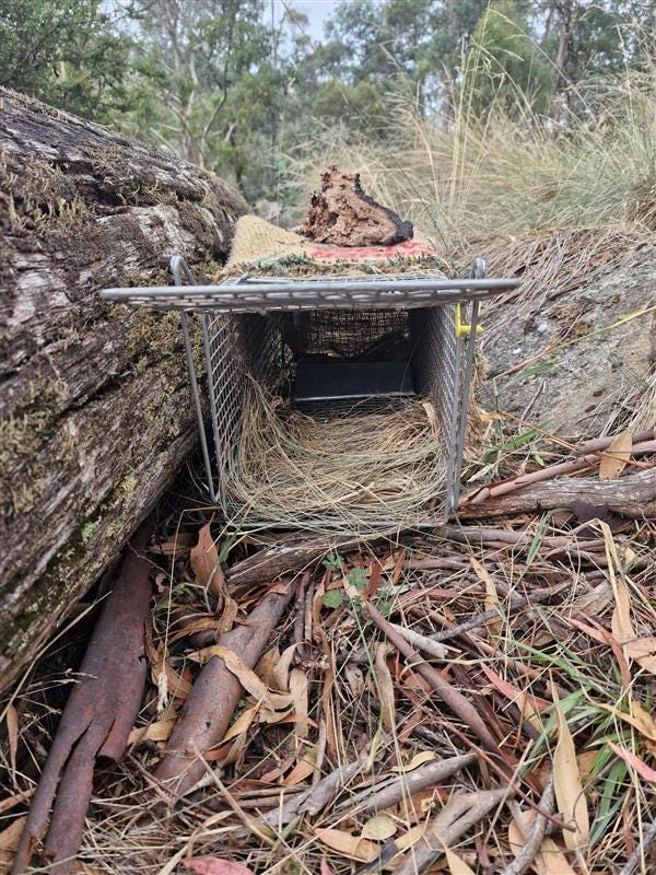 PhD candidates Erin Thomas and Sophia Jackson spent countless hours tracking these devices down across The Quoin and neighbouring properties, with the aim of identifying what habitat the quolls gravitate towards, thereby informing future translocation efforts. There is much analysis to be done yet, but some early examples of den sites chosen by translocated quolls include hollow logs, small burrows in the earth and gaps amongst rock piles.