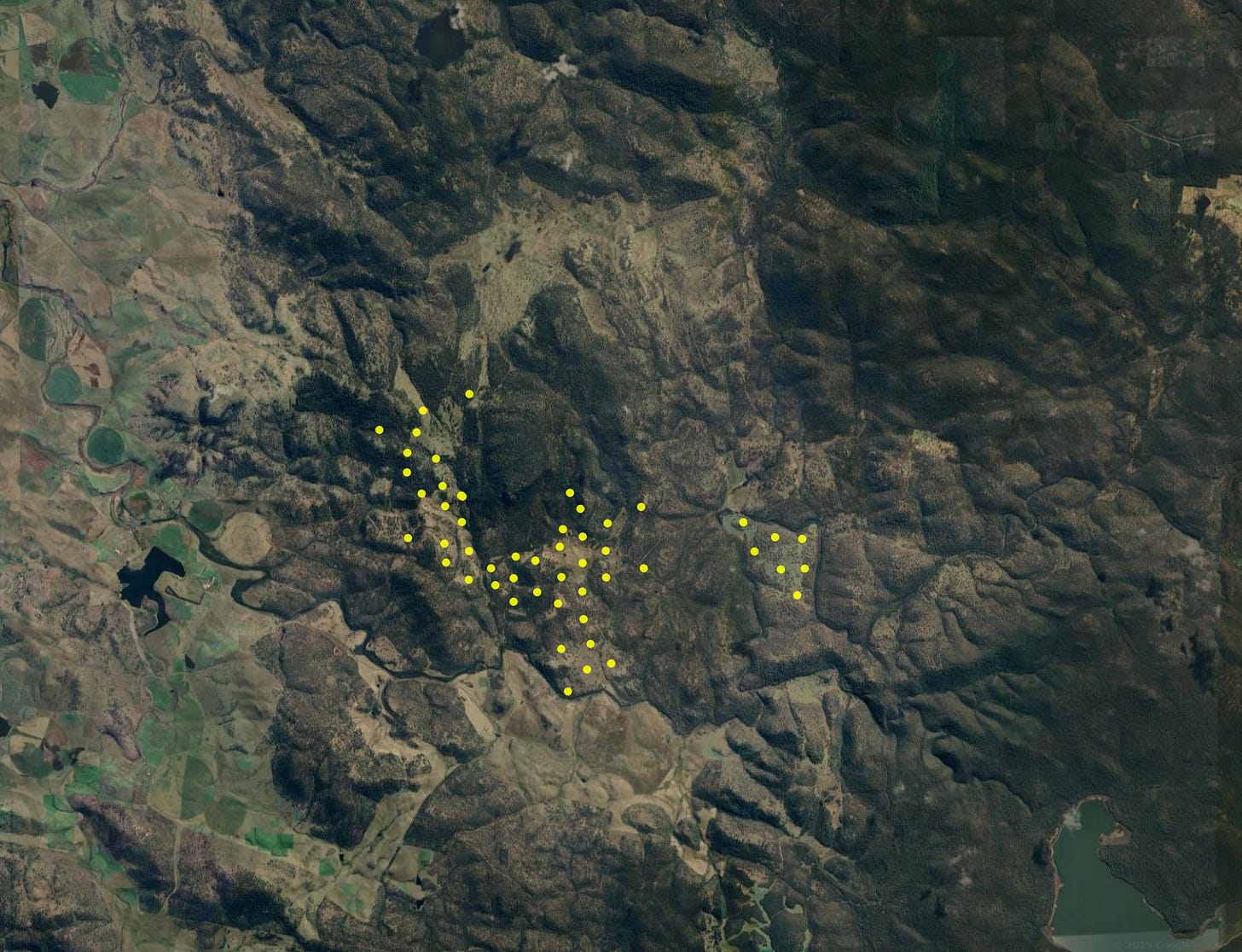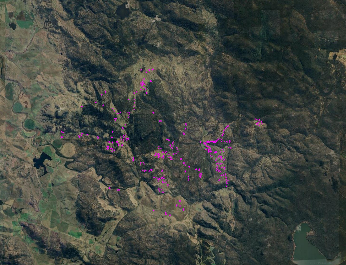 In addition to preferred denning locations, tracking translocated eastern quolls provides us with information on how they move in the landscape. Tracking data can help us record how and where quolls disperse upon release, in addition to their interactions with other translocated quolls and their wild-born counterparts. The map below shows the movements of each quoll over the first two months post-translocation, indicating moderate-level dispersal and a possible preference for open grasslands. Once combined with data from future translocations, this kind of information will help inform future translocations by building a more detailed understanding of habitat use.