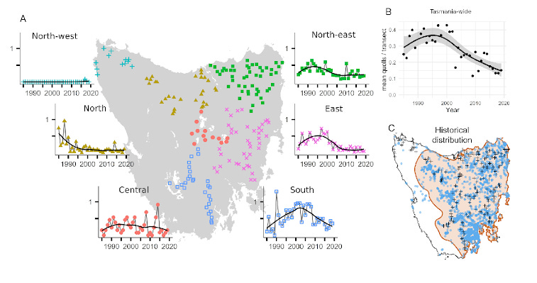 Back in Tasmania, surveys conducted by the state government show eastern quolls have experienced almost two decades of decline, with a particularly steep downward trend in the Midlands and East Coast regions. Periods of unsuitable climate (long, wet winters) around the turn of the century have been hypothesised as a key driver behind the initial drop, but continuing losses are likely due to a complex combination of interacting factors. The root cause of the population decline remains unclear.